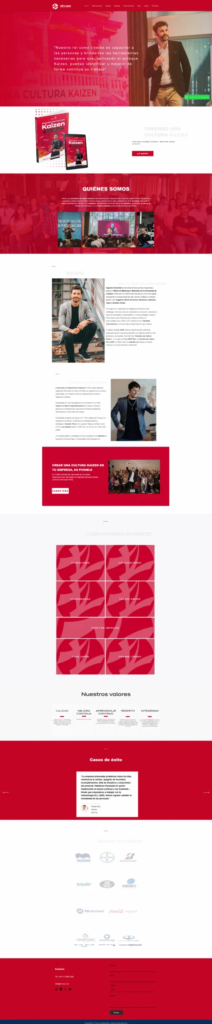Diseño de alto impacto y autoridad: Usamos el color rojo intenso como base, que es un color de poder, pasión y acción. Esto se equilibra con blancos y tipografía limpia. La cabecera es clara con una cita de uno de los fundadores, y muestra inmediatamente su principal producto: el libro “Creando una Cultura Kaizen”.